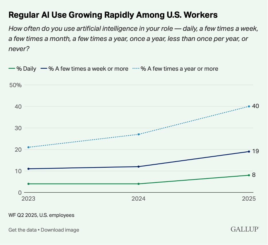 📊 Source: Gallup, 2025 – AI Use at Work Has Nearly Doubled in Two Years https://www.gallup.com/workplace/691643/work-nearly-doubled-two-years.aspx